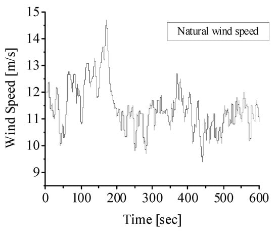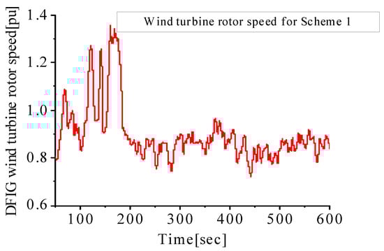 Simulations were run based on the model system in Figure 1 using the natural wind speed data shown in Figure 6, obtained from the Island of Hokkaido in Japan. The simulations were run for 600 s on the PSCAD/EMTDC platform to demonstrate the robustness of the controllers used in the study. The simulation of the grid-connected wind farm was achieved first considering no control strategy in the wind farm; in this case, the wind generator did not have an ECS unit connected nor a flywheel system embedded. Thereafter, wind farm A was connected to the grid network, and the flywheel DFIG-coordinated system (Scheme 1) was used to control the grid frequency dynamics of the power network. In the second scenario, the ECS and fixed-speed wind turbine (Scheme 2) was used to control the grid frequency dynamics of the system. The same wind speed data were used for both schemes for an effective comparative study. The wind farms were connected one at a time to the existing grid network made up of steam and hydro synchronous turbines. The responses for the grid frequency for all scenarios are shown in Figure 7.
