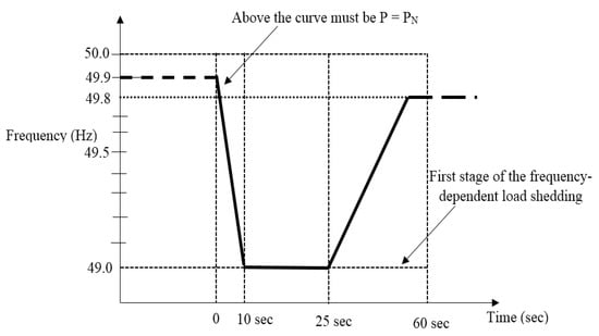 From Figure 7, when Scheme 2 was implemented based on the grid frequency control in wind farm B, better responses were achieved for the grid frequency dynamics during periods of wind speed change, with less distortion in the grid frequency of the power network during these periods compared to that of Scheme 1. A scenario in which no grid frequency control was employed in Figure 7 shows that the grid frequency could drop below 48 Hz, which is not healthy for the power network. In such a situation, the wind farm must be shut down or disconnected from the power network, based on the stipulated minimum requirement of grid frequency levels set by the grid codes for several countries, as shown in Figure 8. A typical grid requirement for grid frequency control during dynamics below 49 Hz requires the wind farm to be disconnected from the grid network.