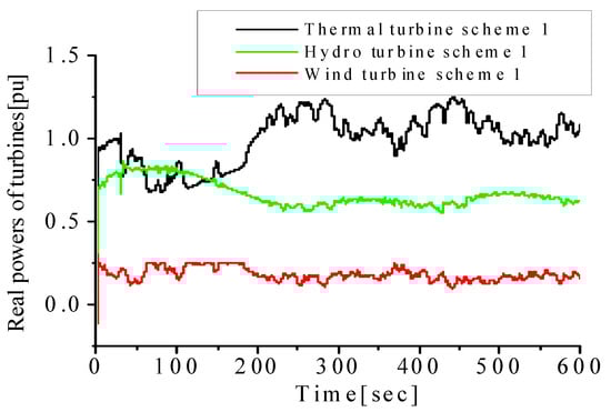 The dynamic responses of the variables of the synchronous generators in the power network are shown in Figure 11 and Figure 12. In Figure 11, the real powers of the steam and hydro synchronous turbines were controlled using the MPPT DFIG Scheme 1 control strategy in wind farm A. In Figure 12, more distortions in the variables of the thermal synchronous turbine were obtained during periods of grid dynamics when no frequency control strategy was implemented in the wind farm connected to the grid network. However, when the ECS scheme in Scheme 2 was employed, an improved response of the steam turbine variable was obtained.