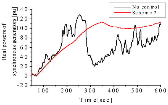 Scheme 1 was able to improve the performance of the power grid during grid dynamics by using the proposed coordinated control of the DFIG MPPT system in wind farm A, as shown in Figure 7, with good frequency performance that follows the same performance of the scenario in which the traditional use of ECS FACTS device in Scheme 2 was employed. There was considerable improvement in the frequency response in Scheme 2 due to the fast compensation during dynamics. However, Scheme 2 did not have the capability of generating power to the grid while contributing to the stability of the grid as in Scheme 1, thus making this one of the targets of this paper. Still, both schemes were able to suit the stipulated grid codes, which requires a minimum frequency dip of 49 Hz. A further investigation of the effects of proper tunning of the proportional integral (PI) controller is demonstrated in Figure 9 for a comparative study of the proposed scheme and the traditional scheme. When the DFIG wind turbine PI controllers were not properly tuned, constant oscillations of the frequency variable existed during dynamics, making the scheme unable to fulfill the required grid codes. However, proper tuning would give the result obtained in Figure 7, fulfilling the stipulated grid codes for effective frequency control. The excess kinetic energy developed by the wind turbine flywheel system based on the control strategy in Figure 3 is shown in Figure 10. From Figure 10, more kinetic energy was generated for energy storage in the flywheel system in Scheme 2 during periods of 100 to 200 s of high wind speed changes above the rated wind speed (12 m/s) of the fixed-speed wind generator based on the nature of the natural wind speed data shown in Figure 6. Thus, no kinetic energy was developed during low wind periods, showing the effectiveness of the controllers employed during the grid’s dynamic periods.