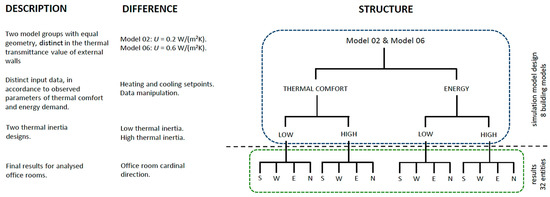 The energy simulation software EnergyPlus 9.0.0 [39] was used to analyse the thermal comfort and energy demand of the simulation models. EnergyPlus is a whole-building simulation tool, which enables to calculate unsteady state energy demand based on climate data and a predefined calculation step. The calculations were carried out for a one-year time period. The geometry and basic simulation data were prepared through Sketchup 5.0.1 [41] and OpenStudio 3.2.1 [42]. The input for simulation data regarding the thermal comfort metrics and the output variables were prepared in EP launch 2.14c [43]. The calculated results were available in the CSV file format and were additionally organized in a suitable spreadsheet format. A total of 8 simulation alternatives were designed and based on the thermal transmittance values, they can be divided into two groups, Models 06 and Models 02. The external wall U-value is 0.6 W/(m2K) for the first group and 0.2 W/(m2K) for the second, in accordance with the Slovenian national requirements from 2002 and 2010. The four simulation models in each group differ in the thermal inertia design and distinct temperature setpoints for thermal comfort and energy demand analysis (detailed explanation in Section 2.1). The results were evaluated for the south, north, east, and west office rooms, aggregating in 32 observed entities. The simulation model design framework is presented in Figure 1.