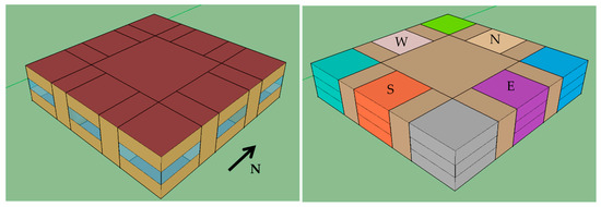 The simulation model emulates an interim office floor with a floor plan of 16 × 16 m and a height of 3.2 m. The floor plan is divided into 4 × 4 m office rooms, which face different orientations. The simulation model is presented in Figure 2. Only office cells facing the cardinal directions are analysed. Each office cell represents a separate thermal zone with the following characteristics: Au = 16 m2, Ve = 51.2 m3. The external walls in the office cells have a window to wall ratio (WWR) of 30%, which is approximately twice the minimum value based on the Slovenian requirements for workplace safety [44]. The assembly compositions and their thermal transmittance values are presented in Table 1. The wall assembly is designed as an external thermal insulating composite system (ETICS).