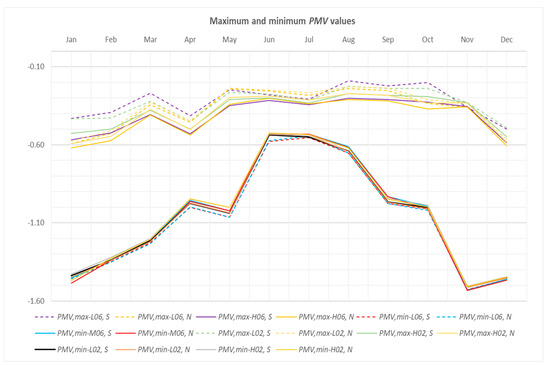Comparing the mean radiant temperatures, we can observe minimal variations, even at the extremes. This is also reflected in the thermal comfort. Figure 5 and Figure 6 show the maximal, minimal, and average PMV values for the south and north oriented rooms of Models 06 and 02, respectively. The differences are small, even for the maximum values which show the most notable variations when considering the influence of orientation and external wall thermal inertia. This indicates that the thermal comfort is comparable for all the observed rooms, for both thermal transmittance values of the external walls.