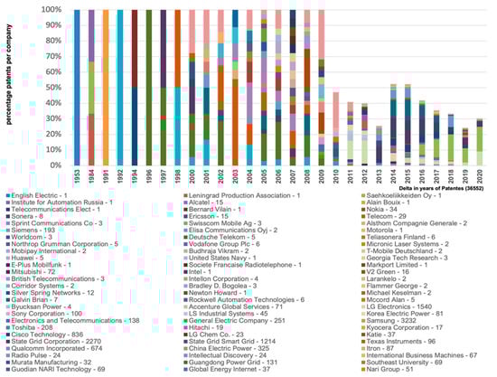 Due to the importance of research and prototyping, the Smart Grid concept made its way into the production of innovative electrical devices that began to be licensed and patented around the world. For example, the first record of a device focused on automatically controlled energy was patent US2677789A, which presented a rectifier circuit controlled in an intelligent network in 1950 by the company English Electric Co [18]. Figure 2 shows the companies that have generated the most patents from 1950 to 2020, the percentage of patents for each company is related to the total number of patents published in that same year that were directly related to Smart Grid systems.