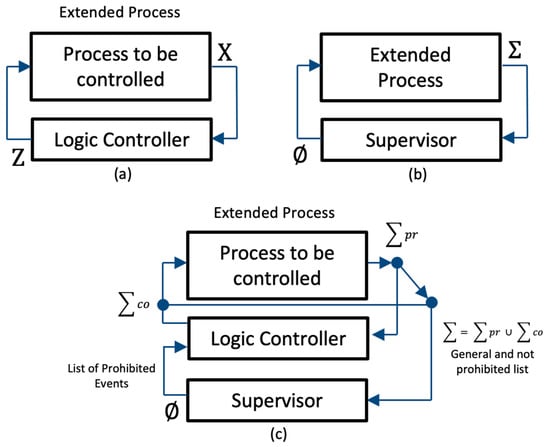 Supervised control. (a) The extended process. (b) The supervisor’s scheme. (c) The supervised control scheme [65].