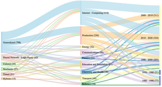 The history of Petri nets in the development of software and hardware for prototypes is very important because it has spurred progress and great changes in the telecommunication, automation, and electrical networks industries. Below, Figure 8 shows a Sankey diagram, where the patents related to R+D+i processes are grouped into technology sectors associated with Petri nets according to the period. For example, in the energy line, there is talk of patents in fault control but focused on energy, or the development of modeling software but focused on energy systems. Finally, there are patents on models to streamline public transport; likewise, other areas can be seen where the Petri net research has culminated in important developments for the industry. It is important to highlight from Figure 9, that all those that did not have a classification were grouped into the generalized Petri nets group.