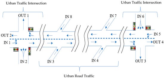These models can be combined by different techniques, which can be from the same PN family but from different sources, such as Bayesian Petri nets and stochastic Petri nets. In this case, one of them can act as the supervisory PN, which controls the events, and the other PN can generate the model through an algorithm for process control. In addition, a combination of hybrid models can be presented. These can be PNs with a discrete or continuous control model. An applied example of the combination of PN techniques is the modeling of urban traffic systems in the city of Turin, Italy, which uses real-time control strategies. The hybrid model uses timed colored Petri nets (TCPNs; Figure 7, section (b) of reference [68]) as a system control of entrances and exits in the intersections; these TCPNs establish the possible stopping times, numbers of vehicles, and flow directions, while the vehicular flow on the road has been modeled through a stochastic discrete-time model (Figure 7). Hybrid model validation has shown that relevant traffic dynamics have been considered, but the real-time computational cost is of low latency and time-saving, making it suitable for real-case applications. The above, due to the simulation, can be performed in parallel for the hybrid model [68].