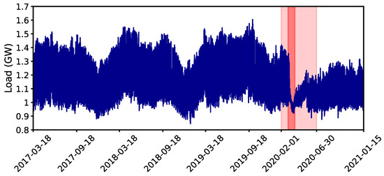 Electricity demand curve of “IEEE DataPort Competition Day-Ahead Electricity Demand Forecasting: Post-COVID Paradigm”. The light red region corresponds to the lockdown period. The dark red area corresponds to the most significant impact on demand during this period.