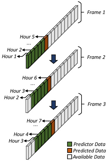 A sliding window method was employed to establish the advance period in hours, used to predict the next hour’s demand. Thus, the window size Δt of 24 h was defined. Figure 3 illustrates the applied method, showing that between one window and the next window, an overlapping of the forecast data of h occurs. Considering the initial hour of a window as , the forecast for that window was made in the hour .