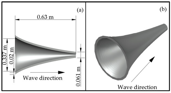 At the Engineering Institute of the National University of Mexico (UNAM) a novel device with the name Blow-Jet was developed and tested, showing acceptable efficiency [25]. The Blow-Jet consists of a Tapchan (tapered channel) and a reservoir, inspired by the naturally occurring phenomenon of a marine geyser. The water flow catchment takes place in a channel of positive slope that narrows as it goes into a reservoir, placed above the mean sea level. The reservoir has three sections: a wide, submerged, or semi-submerged entrance; a compression chamber; and a discharge hole [25,26]. The main disadvantage of the Blow-Jet is its being unable to force the entire captured wave out, which means a loss in efficiency. This can be addressed by improving the design of the compression chamber.