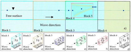 Views of the numerical grid used in Flow 3D. (a) Longitudinal view of the half-domain modeled showing the position of the data recording points (navy blue dots), free surface and wave damper; (b–g) an isometric view of Blocks 1, 2, 3, 4, 5, and 6, respectively. Additionally, the boundaries assigned to each of the faces that make up these blocks are displayed.