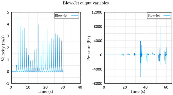 The improved performance of model 10 is seen in the jet velocities, see Figure 15. Given that there will be times with no flux through the output, reaching higher velocities facilitates power generation. This can be aided by an inertial mechanical element (e.g., a flywheel). Therefore, it can be stated that the overall performance of model 10 is better than the original Blow-Jet.