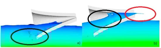 In Figure 4a the black ellipses indicate this wave reflection. This feature is one of the main points in improving the geometry of the existing device. In turn, the occurrence of this reflection in the numerical results is also evidence of its good performance. It is common in different fields, such as science, engineering, medicine, among others, to use numerical models and experimental, theoretical, and practical methods, which are based on assumptions that are considered more qualitatively than quantitatively. Figure 4b also evidences the production of the expelled jet from the output of the Blow-Jet.
