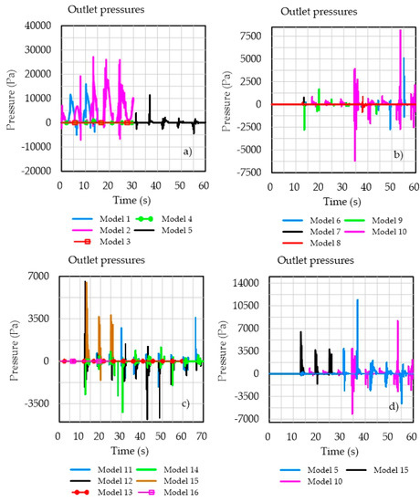 Figure 5 shows the water pressures at the device outlet for all the modeled geometries. Models 1, 2, 10, and 15 produce the highest values. It is worth noting that in models 1 and 2, the outlet was submerged. In turn, model 15 can be discarded as it only produced one pressure peak throughout the simulated time. Model 10 had the best performance, with a mean pressure of 119.7 Pa and with positive and negative peaks of irregular values.