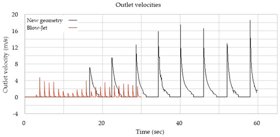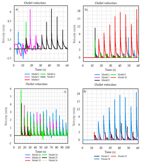 Figure 6 presents the velocities at the outlet for all the geometries. Models 5, 10, and 15 produced the highest values. The velocities of model 5 were less than 2.5 m/s and it had only one, very high, peak. Model 15 presents a regular occurrence of peaks of around 2.5 m/s alternating with gaps of null velocity. Model 10 produced an average velocity of 10 m/s with peaks of approximately 18.5 m/s.