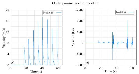 Water velocity showing the expelled peaks (a) and pressure at the outlet (b) for model 10.