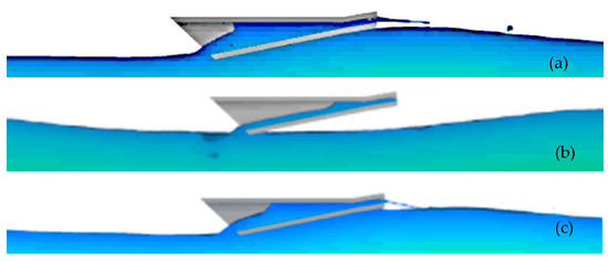 Snapshots of model 10 during the numerical simulation. (a) When full of water, the device had minimized wave reflection, while the expelled water jet was maximum. (b) The emptying of the remaining water through the inlet diameter (larger diameter). (c) The transit of water inside the device.