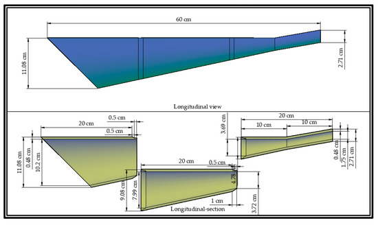 Model 10 was 3D-printed (Figure 9), in 1:20 scale, and instrumented with a Keller (London, UK) Druck PR-36X piezoresistive transmitter at the outlet. The velocity was recorded by an acoustic Doppler velocimeter (Vectrino, Rijeka, Croatia) and the water level by resistance wave gauges. The volume of the expelled jet was stored in a measuring probe, manually. The experimental setup is shown in Figure 10.