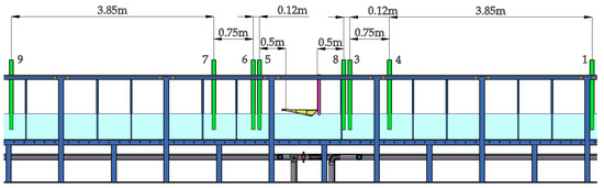 An experimental program to reproduce and validate the numerical results was conducted. As with the numerical results, the variables of interest are the pressure and the water velocity at the outlet. The experiments were carried out in the wave flume of the Engineering Institute of the National Autonomous University of Mexico, which has dimensions of 37 m length, 0.8 m width, and 1.20 m height. The flume has a piston-type wave maker with an active wave absorption system. Representative wave parameters for the Mexican coast were used. These parameters are wave height (H) = 2 m, wave period (T) = 6 s, and the depth (d) was established at 10 m in order to be within the range of validity of second-order Stokes.
