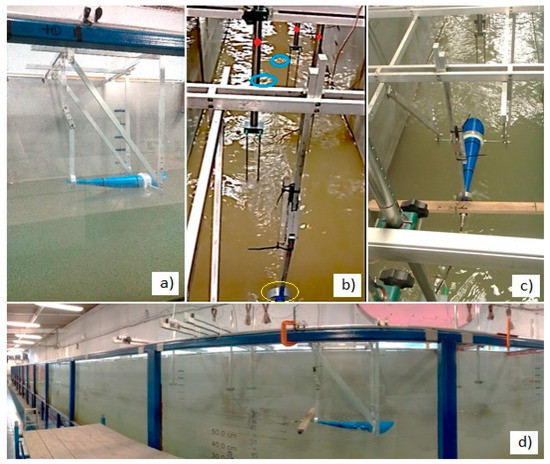 Images taken during the experimental tests. (a) Blow-Jet with its harness; (b) velocity test, showing the Blow-Jet output (yellow circle) and the distance reached by the jets (blue circles); (c) pressure recording test; and (d) panoramic view of the wave flume.