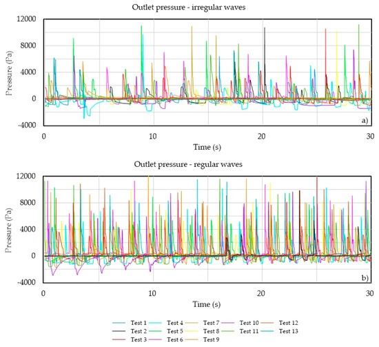 Figure 12 shows the pressures recorded at the outlet of the device for regular waves and irregular waves in the left and right boxes, respectively. For regular waves, the pressure is positively correlated to the wave period. The correlation is less clear for irregular waves, but the higher pressures correspond to the higher energy wave conditions.