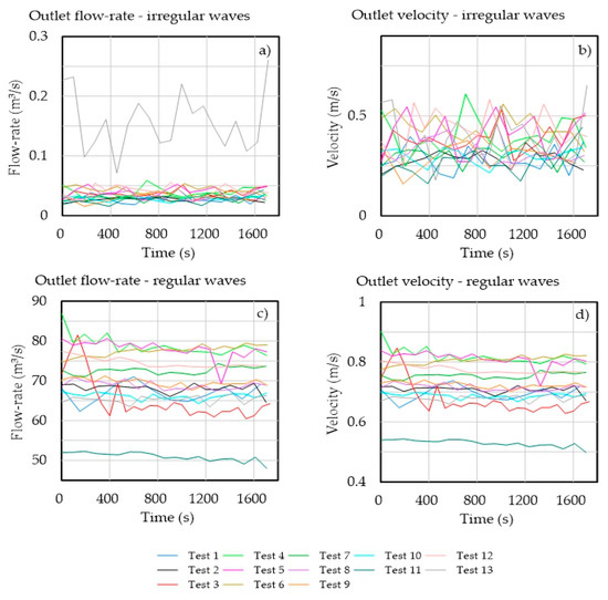 Velocity and flow rate averages of the water jet at the outlet of the device: (a,b) irregular waves and (c,d) regular waves.