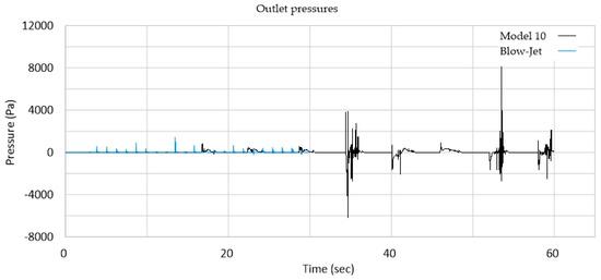 Table 4 presents the maximum outlet velocity (Vo max), average outlet velocity (Vo ave), maximum outlet pressure (Po max), and average outlet pressure obtained from the Blow-Jet and model 10 simulations.