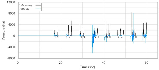 Laboratory tests 1 and 2, under regular wave conditions (Table 3), were used for validation. The results of the numerical tests were scaled to a ratio of 20 to 1 and compared with the experimental data. To facilitate the comparison, the following adjustments were made: the maximum and minimum peaks were eliminated, the recording of the laboratory tests was shortened in time to match that of the numerical model, and the acquisition times of each piece of data was also matched to those of the numerical model, allowing the profiles to be compared. Figure 16, for example, shows the pressures at the outlet. A slight difference and phase shifts can be seen between the laboratory data and the Flow3D results; arguably due to the friction losses and vibration present in the laboratory tests. Nevertheless, a good correlation was found between both sets of data.