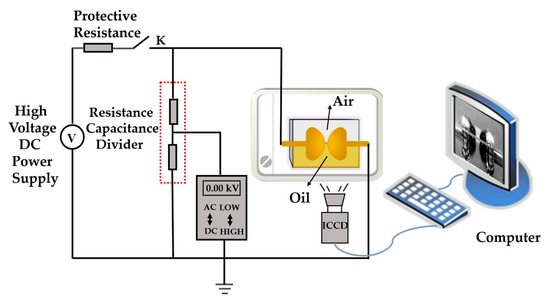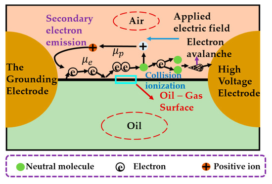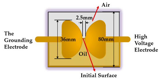 The safe and stable operation of primary power equipment such as oil-immersed reactors and bushing directly determines the reliability of a power system. As an important insulating dielectric of oil-immersed power equipment, the insulation failure of oil can lead to malfunctions in electric transmission and transformation equipment [1,2]. According to the statistical data released by CIGRE (Conference International des Grands Reseaux Electriques, CIGRE), insulation fault accounts for about half of the total power grid malfunctions, and many insulation faults are caused by multiphase dielectric surface discharge [3]. It can be seen that the multiphase dielectric surface, such as the oil–paper surface and the oil–gas surface, is the weak point of insulation. Not only the insulation fault caused by the oil–paper surface flashover but also those caused by the oil–gas surface discharge should be considered.