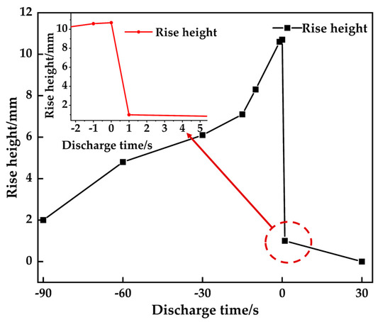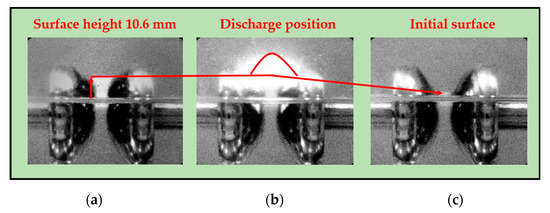 Figure 4 depicts the variation in the liquid surface height with the applied voltage during the oil–gas surface discharge, where 0 s refers to the discharge moment.