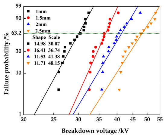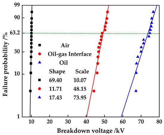 Discharge tests were carried out for the oil–gas surface, air gap, and oil gap. The two-parameter Weibull distribution was employed to illustrate the DC discharge voltage of three different forms, as is shown in Figure 5. The calculated scale parameter and shape parameter are also presented. The scale parameter is the discharge voltage at a cumulative probability of failure equal to 63.2%. The shape parameter indicates the degree of dispersion of the data.