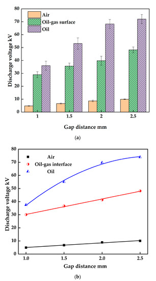 Figure 7a shows that the gap distance has the weakest effect on the air gap discharge and the greatest effect on the oil gap discharge. With the same gap distance, the air gap discharge voltage is the smallest, followed by the oil–gas surface discharge voltage, while the oil gap discharge voltage is the largest. At the gap distance of 2.5 mm, the oil gap discharge voltage is 53.6% higher than the oil–gas surface discharge voltage, which is 7.3 times the air gap discharge voltage.