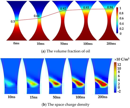 During the process of oil–gas surface discharge, the variation in oil volume fraction reflects the changes in liquid surface height. The oil volume fraction is 0.5, representing the liquid surface at the initial surface. The oil volume fraction increases to 0.94 at t = 200 ms, and the liquid surface rises by 16.1 mm relative to the initial surface. The liquid surface rise is mainly due to the electric field force applied to the fluid unit. When the electric field force balances exactly with gravity and surface tension, the oil volume fraction stabilizes, and the liquid surface reaches the equilibrium height. The oil is a weakly polar dielectric. The dielectric produces a polarized charge polarization with the external electric field, expressing itself as an electric dipole moment in the electric field direction. Although the dielectric is still electro-neutral, the polarization charge, also called bound charge, will appear at the two dielectric surfaces, thus causing the oil–gas surface to be affected by the electric field force.