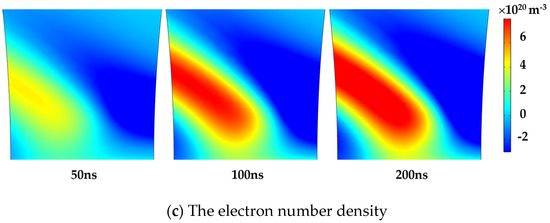 As space charge can affect the distribution of the electric field, space charge development is first concerned during the oil–gas surface discharge. Since the oil–gas surface discharge occurs on the air side and is mainly the contribution of electrons, it focuses on electron density changing on the air side. Meanwhile, the change in oil volume fraction is also analyzed due to the rising liquid surface between the electrodes, shown in Figure 8. Streamer discharge is a general term for various discharge initiation and development processes before the dielectric breakdown, characterized by high ionization and rapid development. Figure 9 depicts the motion process of charged particles during the streamer discharge [40,41].