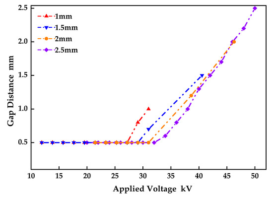 As seen in Figure 6, the oil–gas surface discharge voltage increases with increasing gap distance. At the gap distance of 1 mm, the discharge voltage is 30.07 kV, and it rises to 48.15 kV by increasing the gap distance to 2.5 mm, an increase of 60.13%. In the case of a 0.5 mm gap distance increase, the discharge voltage increase is not equal. When the gap distance rises from 1.5 mm to 2 mm, the discharge voltage increases by 4.64 kV, which is the smallest increase.
