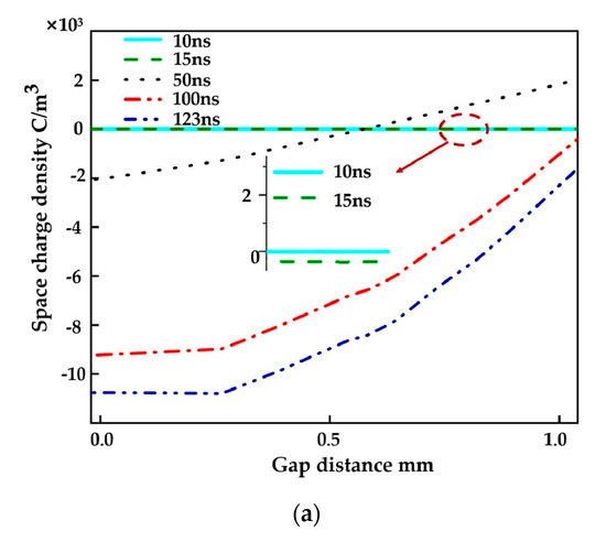Figure 11 depicts the trend of space charge variation at the surface along the radial direction. The smaller the gap distance, the higher the charge density at the surface. The maximum charge density at the surface is 72.7 C/m3 as the discharge develops to 100 ns. The charge density is 9.06 × 103 C/m3 at the 1 mm gap distance. Moreover, at the gap distances of 1 mm and 1.5 mm, the space charge near the anode is positive, while the space charge near the cathode is negative. Because the mobility of positive ions is much smaller than that of electrons (less than 5 orders of magnitude), the displacement is small in the time scale of the streamer development. The space charge near the cathode is positive at 2 mm and 2.5 mm gap distances. Since the avalanche has not yet developed into the anode, it has formed a streamer from the cathode to the anode. The difference in mobility between electrons and positive ions causes the electrons to sit in the crash head and the positive ions to stay in the crash tail. In addition, the electric field strength in the gap can affect the discharge form at the oil–gas surface. When the gap distance is 1 mm and 1.5 mm, the streamer discharge starts from the anode and develops to the cathode, called an anode streamer. When the gap distance is 2 mm and 2.5 mm, the discharge develops from the cathode to the anode, which is called the cathode streamer.