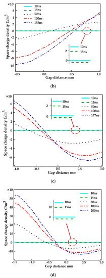 Variation in space charge at different gap distances: (a) 1 m; (b) 1.5 mm; (c) 2 mm; (d) 2.5 mm.