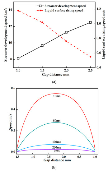 (a) Effect of gap distance on the velocity during the oil–gas surface discharge. (b) Variation in liquid surface rising speed at 2.5 mm gap distance.