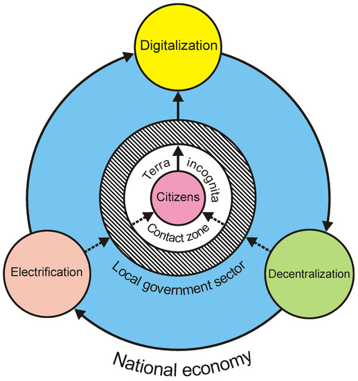 digitalization; energy transition; local government sector; virtuous cycle of digitalization; decentralization and electrification; more-than-human energy contact zone; human administrative legal contact zone; autoethnographic texts; transculturation; multiple correspondence analysis; principles of prosumption 1. Introduction