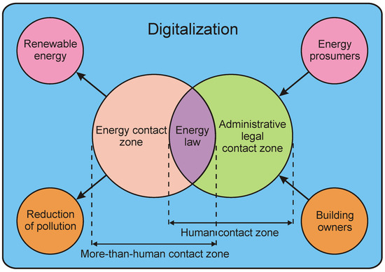 In the energy contact zone, citizens encounter both what is human and what has a more-than-human character. An integral part of this zone is the energy law, which deals with problems related to energy production and its impact on the environment, relations of prosumers with energy companies, renewable energy sources, human–natural relations, environmental issues, preserving biodiversity, reducing pollutant emissions, meeting climate goals, and issues related to energy efficiency in buildings. As mentioned above, the middle class, particularly energy prosumers and building owners, have a big role to play here. The two groups have different goals. Energy prosumers specialize in the production of energy from renewable sources, while building owners focus on using the latest construction techniques to increase the energy efficiency of their buildings. Of course, the same people may find themselves in both groups. These groups are shown in the right part of Figure 2, while the left side shows their goals. Both groups and goals are represented by circles, with the colors of the circles emphasizing the relationships between them. For example, the energy prosumers are represented by a purple circle, and the same color is given to the circle corresponding to their objective, i.e., the production of renewable energy. Similarly, the two circles representing the building owners and their goal of reducing pollution are marked in orange. Achieving these objectives depends on the presence of citizens in two interconnected contact zones: the human administrative legal contact zone and the more-than-human energy contact zone.