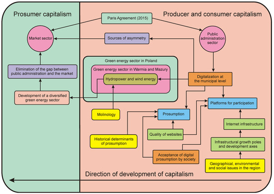 In Figure 3, the impact of similar factors, elements, variables, and actions is marked with the same color. Sustainable development of the national and local economy requires that the public administration sector achieves a similar level of digitalization as the market sector, which is to ensure an appropriate level of compatibility between them in terms of economic models and processes. For this reason, both sectors were marked with circles of the same size, placed at the same level and given the same light purple color. Similarly, there are groups of factors such as acceptance of digital prosumption by society and digitalization at the municipal level (orange), prosumption and platforms for participation (blue), and sources of asymmetry and elimination of the gap between public administration and the market (purple). Infrastructural growth poles and development axes are correlated with the quality of websites and Internet infrastructure (green). Moreover, three important groups of non-economic factors shaping the province in question include geographical, environmental, and social issues in the region, historical determinants of prosumption, and molinology, which is why all these were marked in yellow. The area occupied by producer and consumer capitalism was marked in pink, and the space of prosumer capitalism was marked in light green.