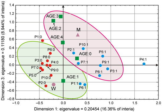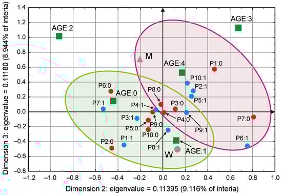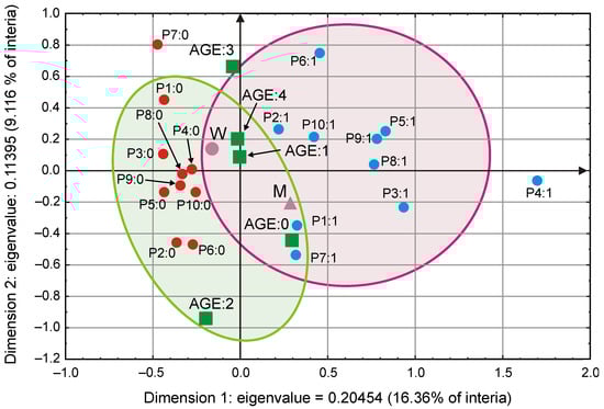 Table 6 shows the coordinates of twenty-seven columns, and it also includes the statistics of the quality of the solution. This information is needed to graphically illustrate the co-occurrence of such phenomena as sex and age of respondents with the non-selection (symbol 0) or the selection (symbol 1) of ten postulated principles of prosumption applicable in the local government sector.