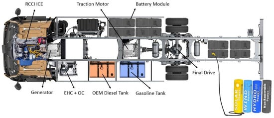 The series PHEV has two electric motors: the traction motor (TM) coupled to the wheels, and the generator (GEN), which is coupled to the ICE. These three components have a maximum power of 210 hp. The OEM ICE is modified to be able to operate with diesel and gasoline under the RCCI combustion mode. It is important to note that due to electrical losses in the charge station, cables, and battery, an efficiency of 5% is considered for external charging. In this work, a full charge is defined as SOC = 1.0, and a fully discharged battery as SOC = 0.1. The vehicle numerical models with the most important components for the three powertrains studied in this work are shown in Figure 2.