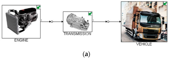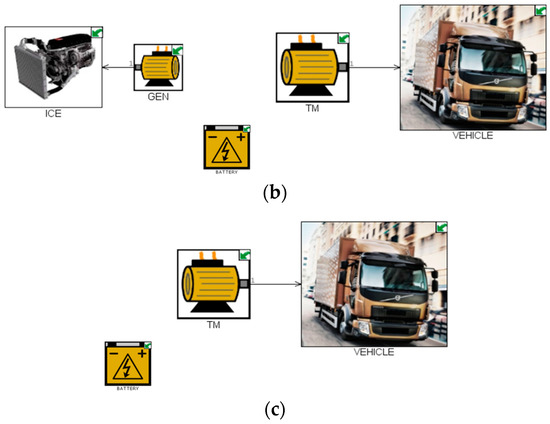 GT-Suite model layout of the nonhybrid (a), plug-in hybrid (b), and pure electric truck (c).