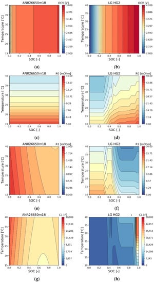 Three-dimensional maps for the parameters of OCV, R0, R1, and C1 versus different ambient temperatures and state of charge. ANR LFP cell OCV (a), LG NMC cell OCV (b), ANR LFP cell R0 (c), LG NMC cell R0 (d), ANR LFP cell R1 (e), LG NMC cell R1 (f), ANR LFP cell C1 (g), and LG NMC cell C1 (h).