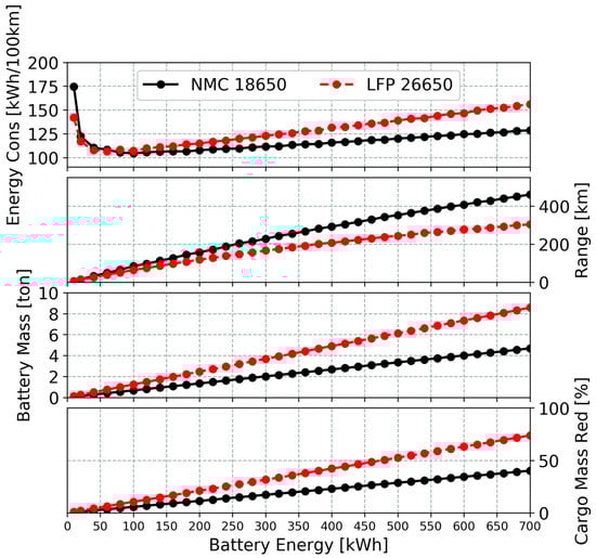 Preliminary to understanding the battery type effect, a design of experiment (DoE) of various battery sizes is carried out for both cells, ranging from 40 to 700 kWh in the BEV under the homologation world harmonized vehicle cycle (WHVC) for heavy-duty applications. The cylindrical cells are connected in series to achieve 600 V. Therefore, the NMC pack has 167 series cells, while the LFP increases up to 182 series cells. The parallel number of cells depends on the total capacity of the battery.