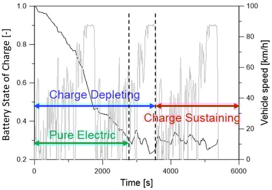 Cycle test for the PHEV. The phase pure electric mode, charge depleting, and charge sustaining are marked as a function of the battery state of charge (SOC).