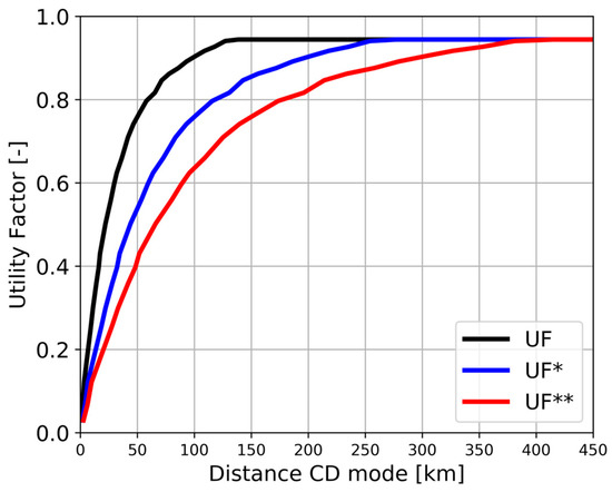 Representation of the utility factor used in this study. UF is the PHEV light-duty vehicle defined by SAE J2841, UF* is the scale version multiplied by two, and UF** the scale version multiplied by three.