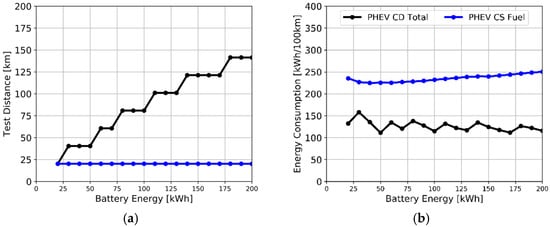 Two situations were used to evaluate the PHEV series truck. The charge depleting (CD) mode, in which the truck begins with 100% battery power (SOC = 1) and operates under a WHVC with 50% payload until the minimal SOC is attained. If that occurs in the middle of a WHVC, the truck completes the cycle in sustaining mode (the ICE/generator is turned on to maintain the battery state of charge), and at the end of the cycle the test is stopped. The other situation is charging sustaining mode (CS). In this case, the truck begins this test with a battery SOC of 0.3 and only performs one WHVC (20.1 km). The LFP 26650 cell is used for the PHEV at a variety of battery package sizes (20 to 200 kWh). Figure 10a shows the distance travelled, as determined by simulations. The CD mode permits a range of 140 km when the battery is above 180 kWh, and is almost entirely electric.