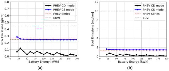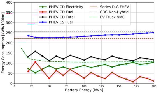 Figure 10b depicts the cycle’s energy consumption (liquid fuel energy in the tank plus electric energy in the battery). In the case of the CS mode, the larger battery increases energy consumption, since it adds weight to the vehicle that is not used for propulsion. The average consumption under the CS mode is 126 kWh/100 km, compared to 235 kWh/100 km under the CD mode. It is important to notice that the CD energy is split between fuels to terminate the final WHVC and electricity used for practically all of the voyages. Depending on the battery range and cycle phase, 73% to 94% of cycles for various battery sizes are conducted exclusively in electric mode. The CS mode performs best near the battery capacity of 41 kWh; this is due to the trade-off between battery weight and battery efficiency. In small batteries, the losses due to the high current rates make the system more inefficient.
